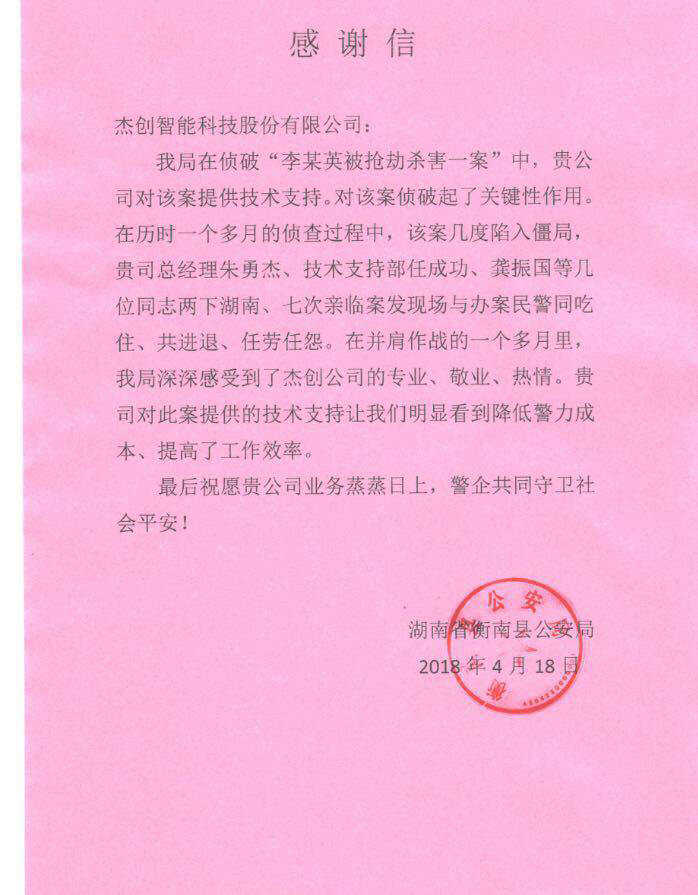 近日,湖南省衡南公安局发来感谢函,对Z6.COM-尊龙集团智能在近期协助侦破“李某英被抢劫杀害一案”表示感谢,目前相关犯罪嫌疑人已被依法刑事拘留,案件正在进一步侦办中。
